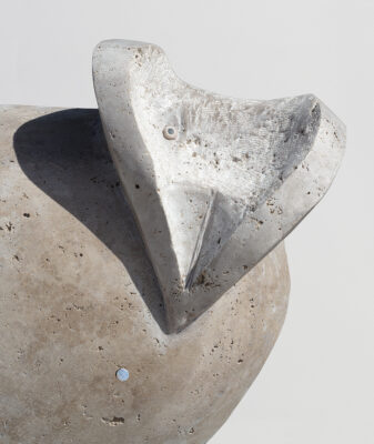 Emma Jääskeläinen says she thinks of people who are important to her when she makes her sculptures, and the works are often portraits of a kind. Ceramic rooster whistles inherited from her grandmother remind Jääskeläinen of her grandmother’s musical home. In the exhibition, the two large bird-shaped sculptures are placed in different positions on the floor. Both of them have holes in their sides to allow sound from within to escape; they may also be openings that enable the birds to breathe. There’s a hope inside my heart that wants to get out, a hollow bird originally sculpted from clay, is now cast in heavy bronze, the original nature of the clay preserved by the grey colouring. In its mouth, it carries a worm-eaten twig, a message from beneath the soil. The second bird, Kiss kiss, kisses for rainy days is carved from Noce Travertine and rests its head on its breast as though settling down to sleep, or waiting for some as yet undetermined thing. From its beak, it gurgles coins carved on its chest, like kisses blown to someone.