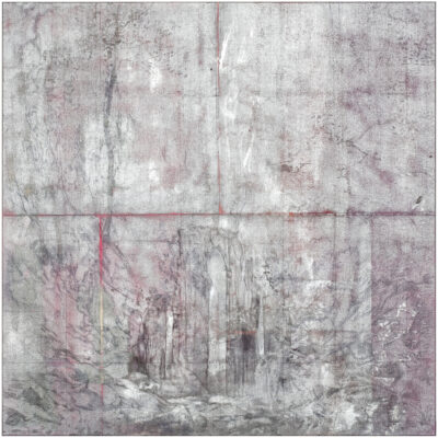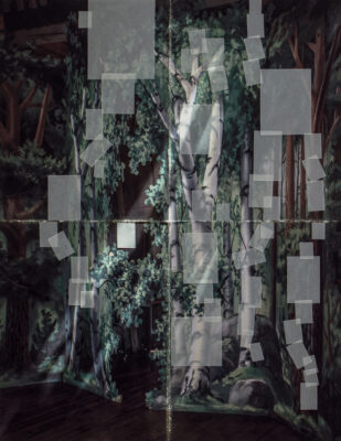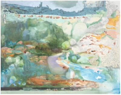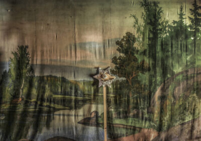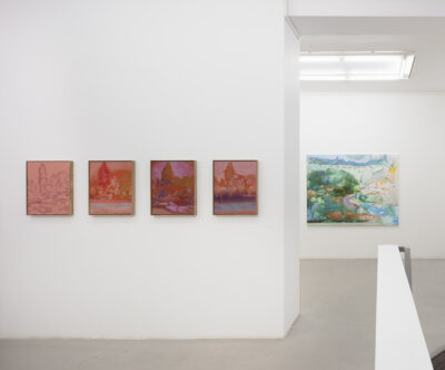 Hiltunen’s landscapes are laminated with imagined and experienced places: rolling fields in Normandy, layers of a summer garden in the Gulf of Finland, ruins of romantic literature, hopes and dreams. In the works, time builds up in layers, alternately condensing and dissolving, accelerating and slowing down. Bright greens, luscious reds, lilac purples, quiet grey, rich ochre and glowing orange are rendered in layers of oil and acrylic paint, pencil, oil pastel, and coloured pencil. A ghostly reverse side of the image emerges on the paper, rendered in dark ink. In the photographic work that opens the exhibition, Hiltunen returns to a stage image familiar from childhood. Theatricality is also present in the diptych that dominates the end wall of the main gallery. Like a backdrop for a theatre play or an old photograph, it invites us to imagine a different world.