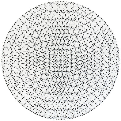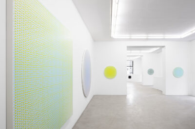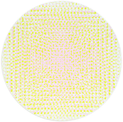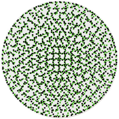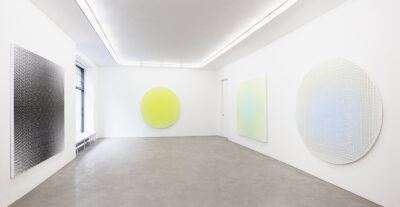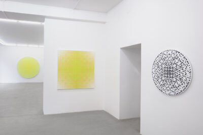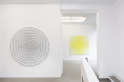 Kujasalo’s works build upon a premeditated configuration of vertical and horizontal lines on a square or circular canvas. The paintings are produced using a simple ‘recipe’ consisting of a few calculatory lines on a piece of paper. The works are made fully manually with nothing but a brush, a calculator, tape and a craft knife. Each layer of colour is first taped out and then painted in numerous thin coats, until finally all the tape is removed and the painting is complete. It is interesting to note how the this systematic and precise process is able to accommodate the uncertainty and unexpectedness of the final result. Order and chance are in constant dialogue in the works.